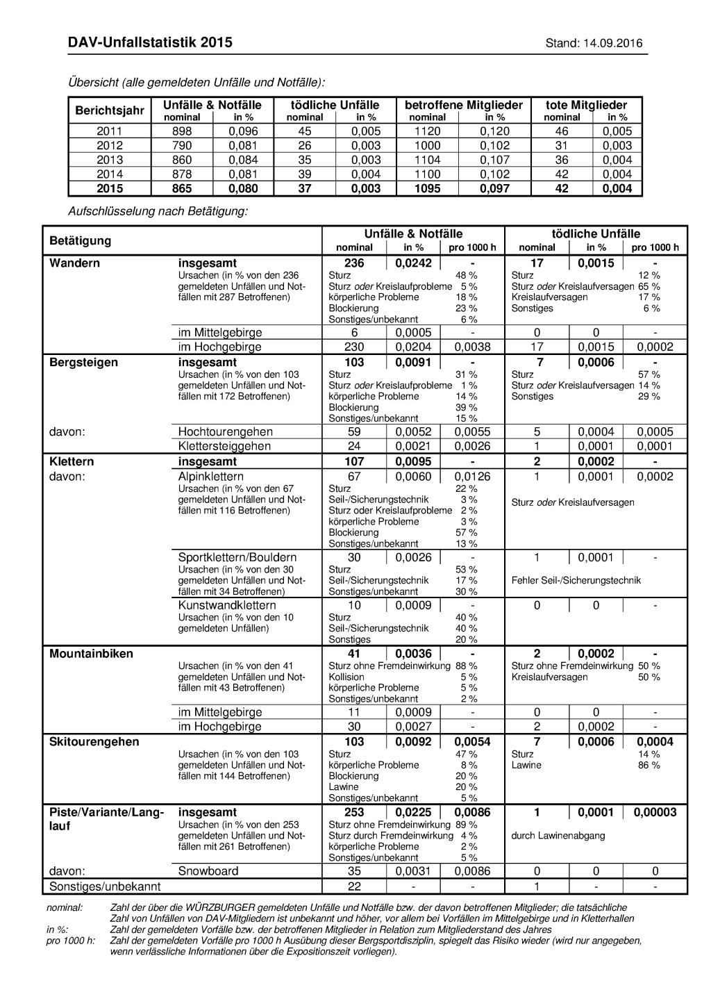 In der DAV-Bergunfallstatistik werden ausschließlich die Unfälle von DAV-Mitgliedern erfasst – unabhängig davon, wo diese Unfälle passieren. Eingang in die Statistik finden Unfälle, die die Mitglieder an die Versicherung des DAV (Alpiner Sicherheits Service – ASS) melden, um beispielsweise Bergungskosten erstattet zu bekommen. Eine Ausnahme ist die neue Statistik zu den Unfällen beim Indoor-Klettern. Weil dort in aller Regel keine Bergekosten anfallen, liegen auch kaum Versicherungsmeldungen vor. Deshalb baut der DAV derzeit gemeinsam mit dem Kletterhallenverband KLEVER ein Netzwerk zur Meldung von Unfällen auf.