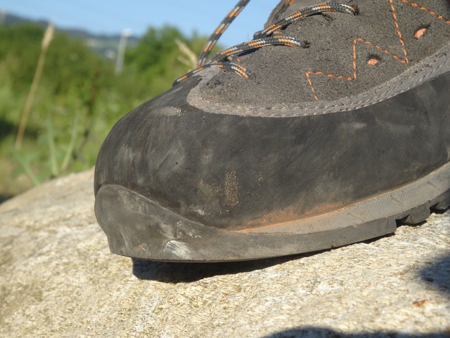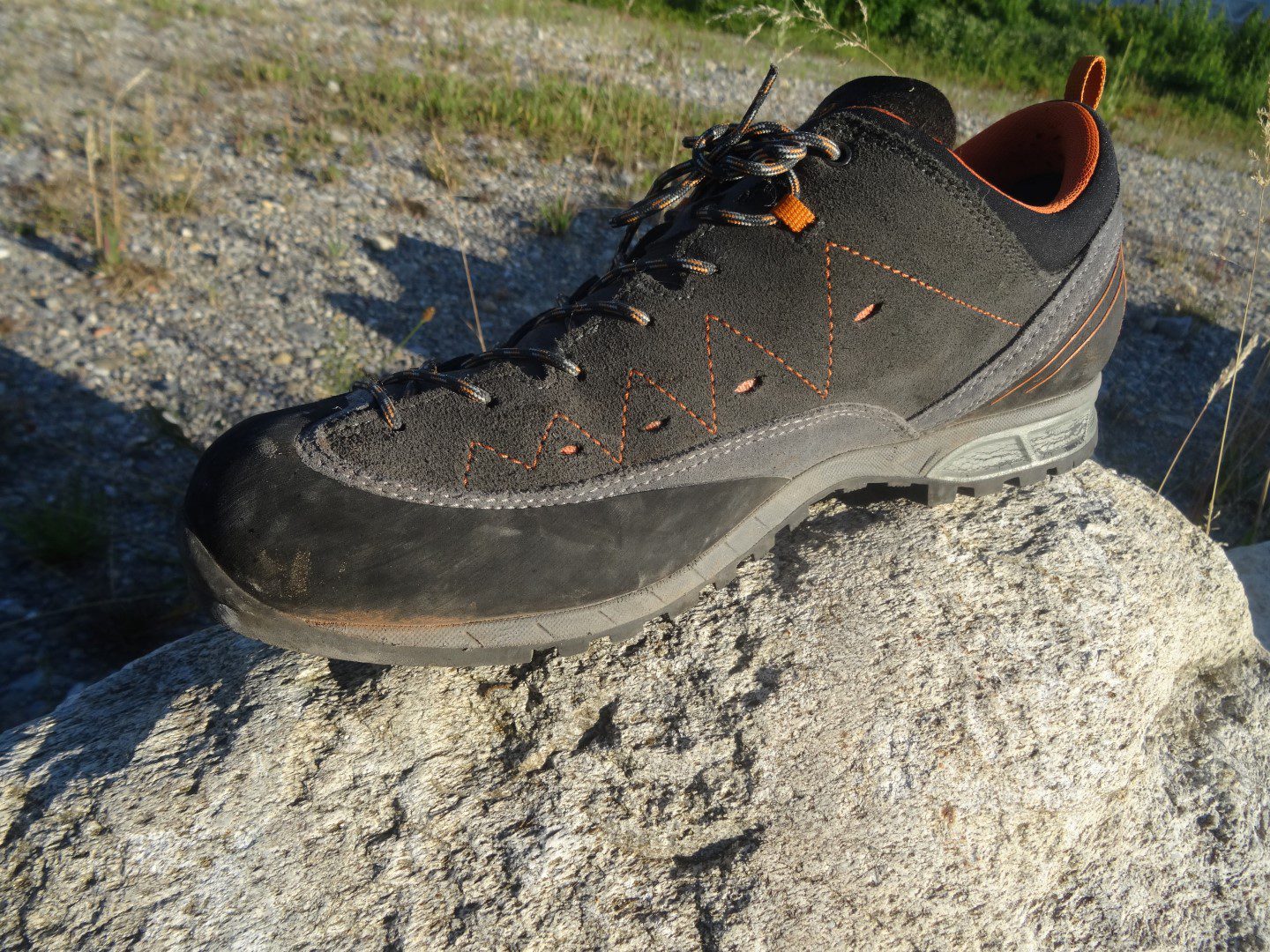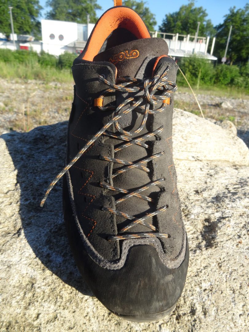 Der Asolo Apex GV trägt sich bequem und ist für einen Zustiegsschuh sehr robust. Die umlaufenden Gummierung im Vorderbereich (Geröllschutzrand) schützt den Schuh in gerölligem Gelände entsprechend. Die Verarbeitung der Nähte ist tadellos. .