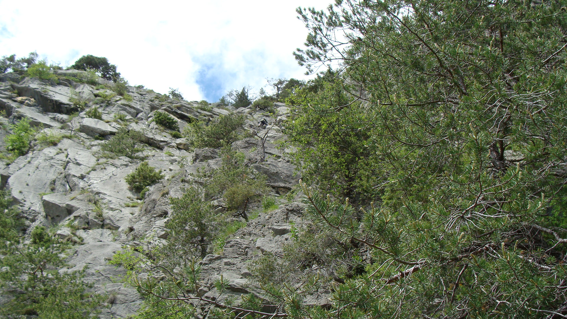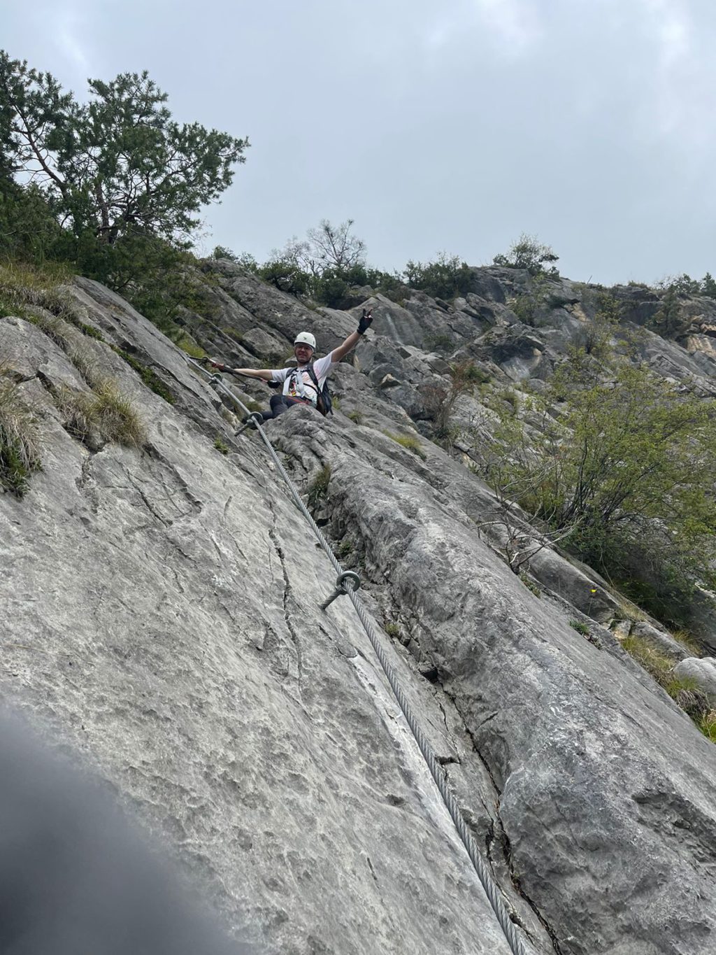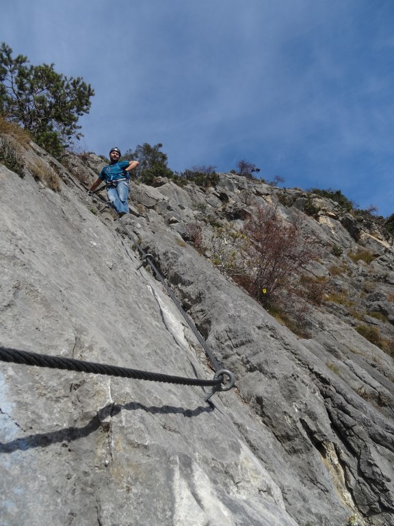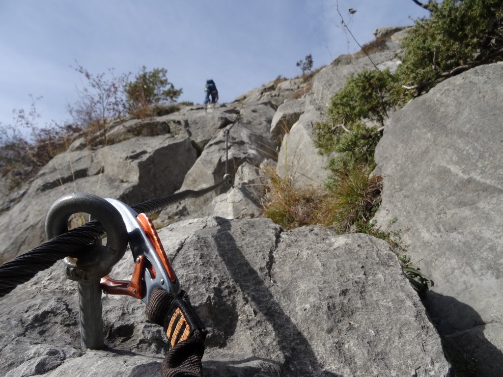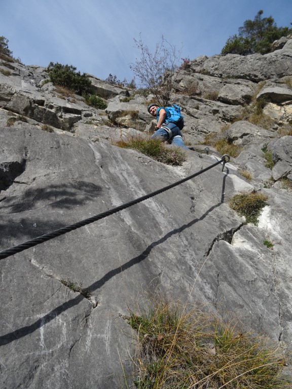 Steighilfen gibt es auf der ersten C/D Passage keine, deshalb wird viel am Fels (oder am Seil) geklettert. Ich empfehle, lange Handschuhe anzuziehen.
