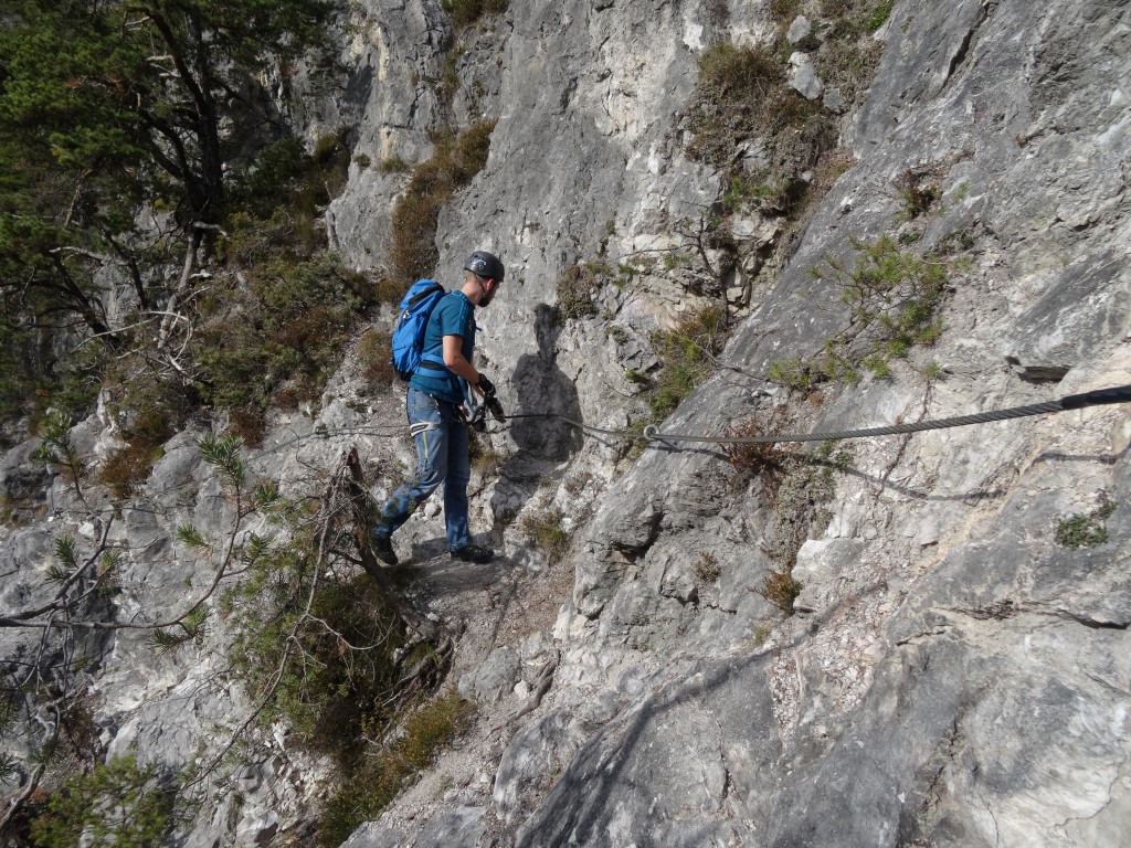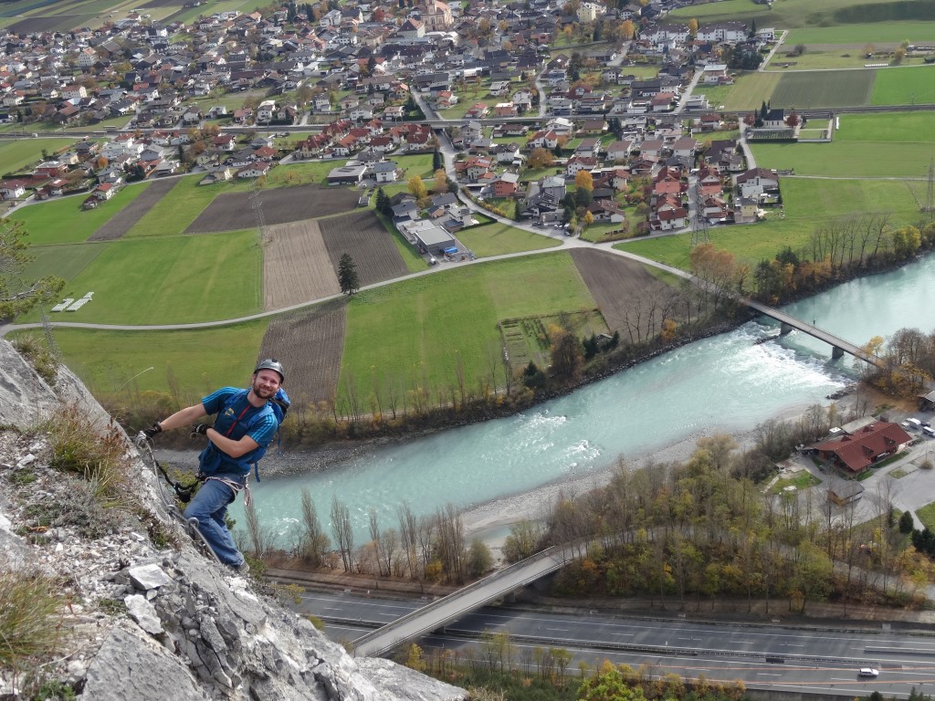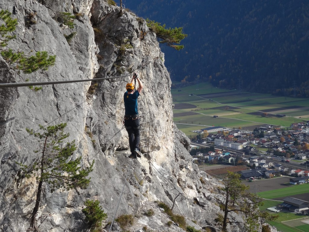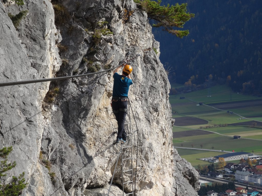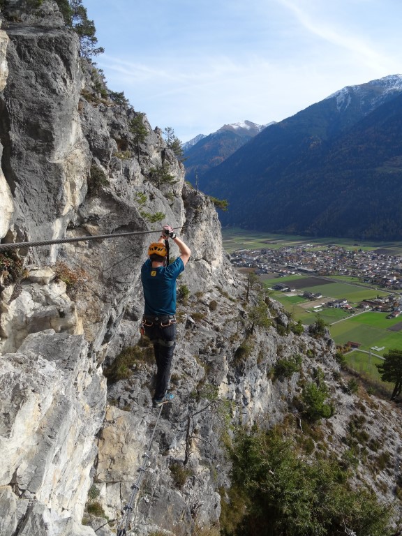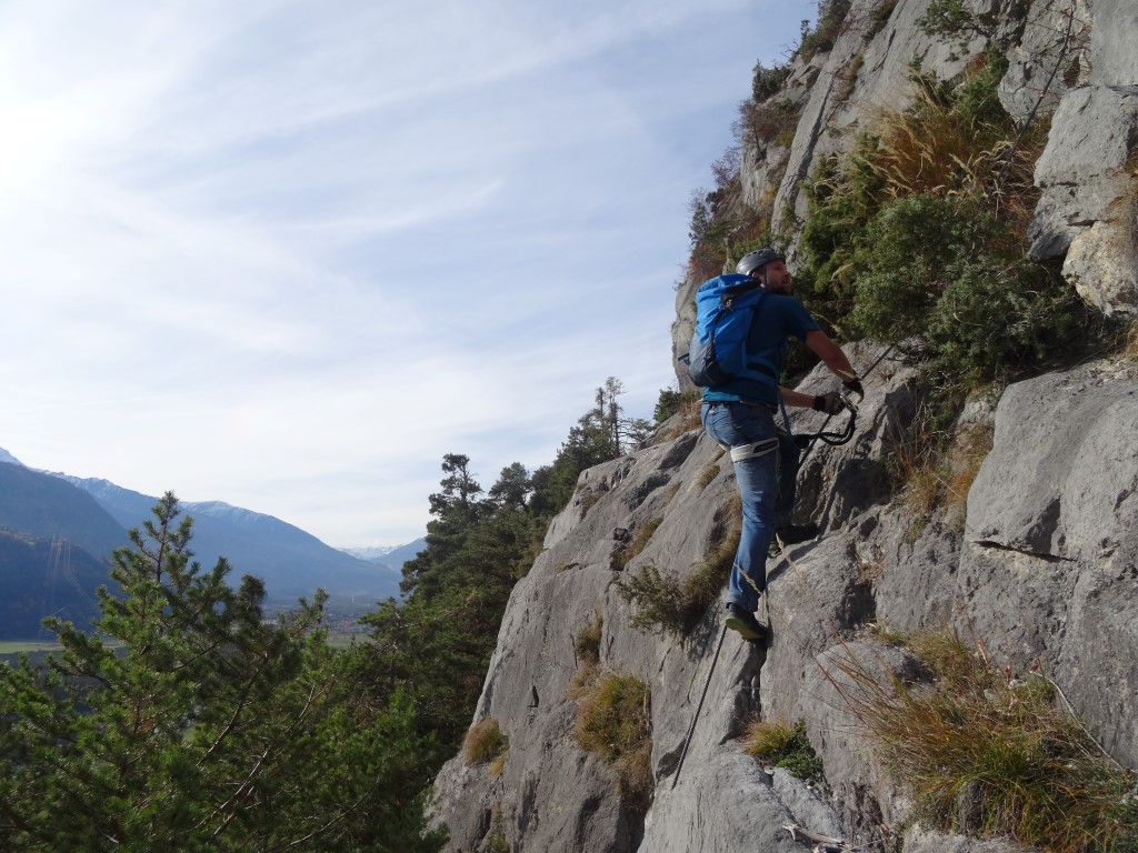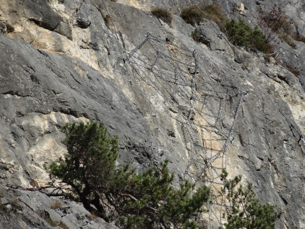 Damit komme ich – nach dem positiven Eindruck – zu den Negativpunkten. Die Ausschilderung ist miserabel. Wir sind, dem Fußweg folgend, bis zum Spinnennetz (zu dessen Sinnhaftigkeit an einer Felswand in den Alpen ich mich aus Höflichkeit den Erbauern gegenüber eines Kommentars enthalte) gewandert. Dort haben wir etwas ratlos gesucht und sind auf den Ausstieg des Steigs gestoßen. Ein kleines Hinweisschild an der unteren Wegegabelung wäre sicherlich hilfreich. Noch nerviger ist allerdings die Permanentbeschallung aus Richtung Inntalautobahn. Wenn ich nicht noch den CE I auf meiner Agenda für 2017 hätte würde ich nicht mehr hinfahren. KS-Gehen als Form des Bergsteigens ist für mich persönlich mit Ruhe verbunden. Diesem Anspruch wird der CE in keiner Weise gerecht. Deshalb nur 3 1/2 Sterne von mir.