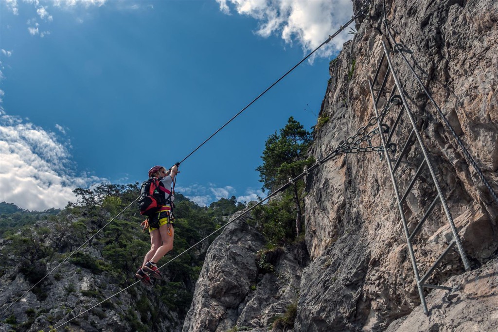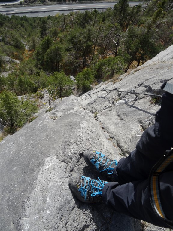 Die D Stellen sind knackig aber nie wirklich schwierig. Die Seilbrücke im oberen Teil erfordert lange Arme oder eine gute Rastschlinge ^^