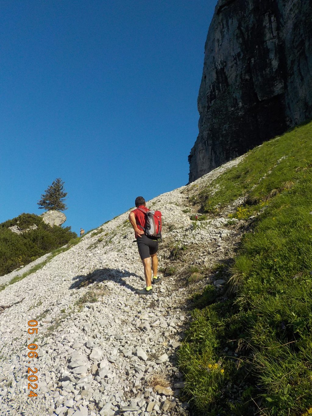 Der Zustieg gestaltete sich schon schwierig, weil das dortige Wegenetz Winterschäden erlitten hat und die Wege teilweise weggeschwemmt oder von Muren begraben waren. Deshalb haben wir uns auch im Aufstieg etwas verstiegen, und mussten da schon ein- zwei steile Schneefelder queren.